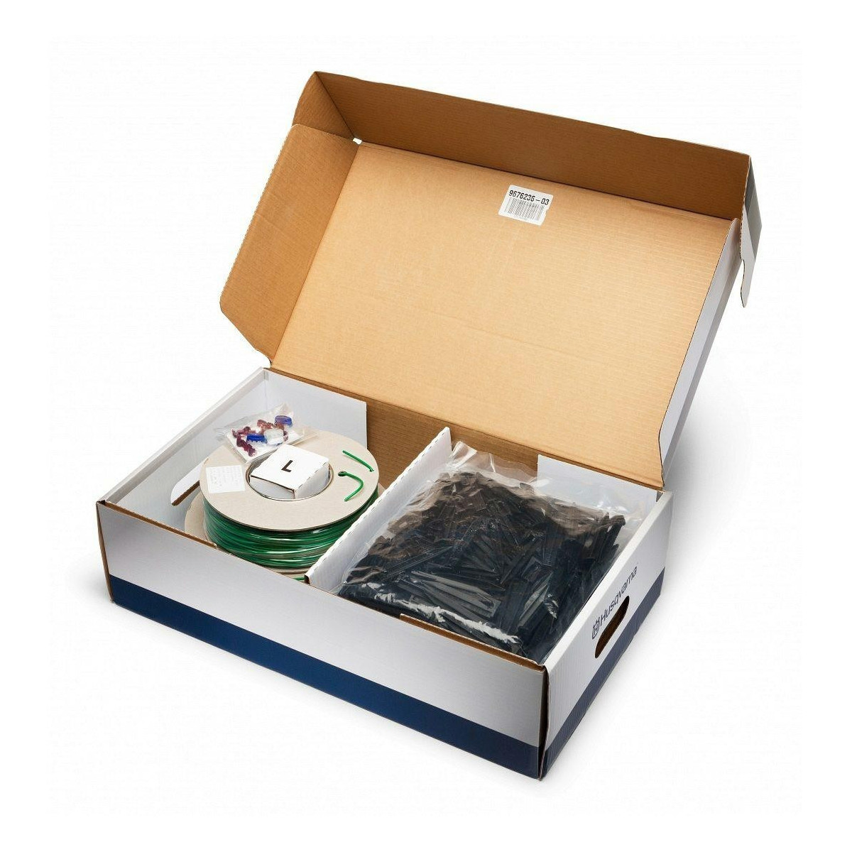 Zestawy instalacyjne zawierają przewód ograniczający o różnej długości, szpilki, złączki i wsuwki w różnej ilości. Zestaw duży - do otwartych powierzchni trawiastych do 5000 m2 lub skomplikowanych trawników do 2500 m2.