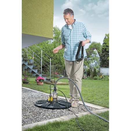 Trwały korpus ze stali szlechetnej zwiększa odporność pompy na wstrząsy i mechaniczne uszkodzenia oraz umożliwia pompie bezpieczną pracę pod wodą. Stalowy filtr zabezpiecza urządzenie przed piaskiem i innymi cząstkami zanieczyszczeń. Przyłącz węża 3/4” i 1” z zaworem zwrotnym i zaciskiem węża. Włącznik pływakowy chroni pompę przed uszkodzeniem, zatrzymując jej działanie w przypadku zbyt niskiego poziomu wody.
